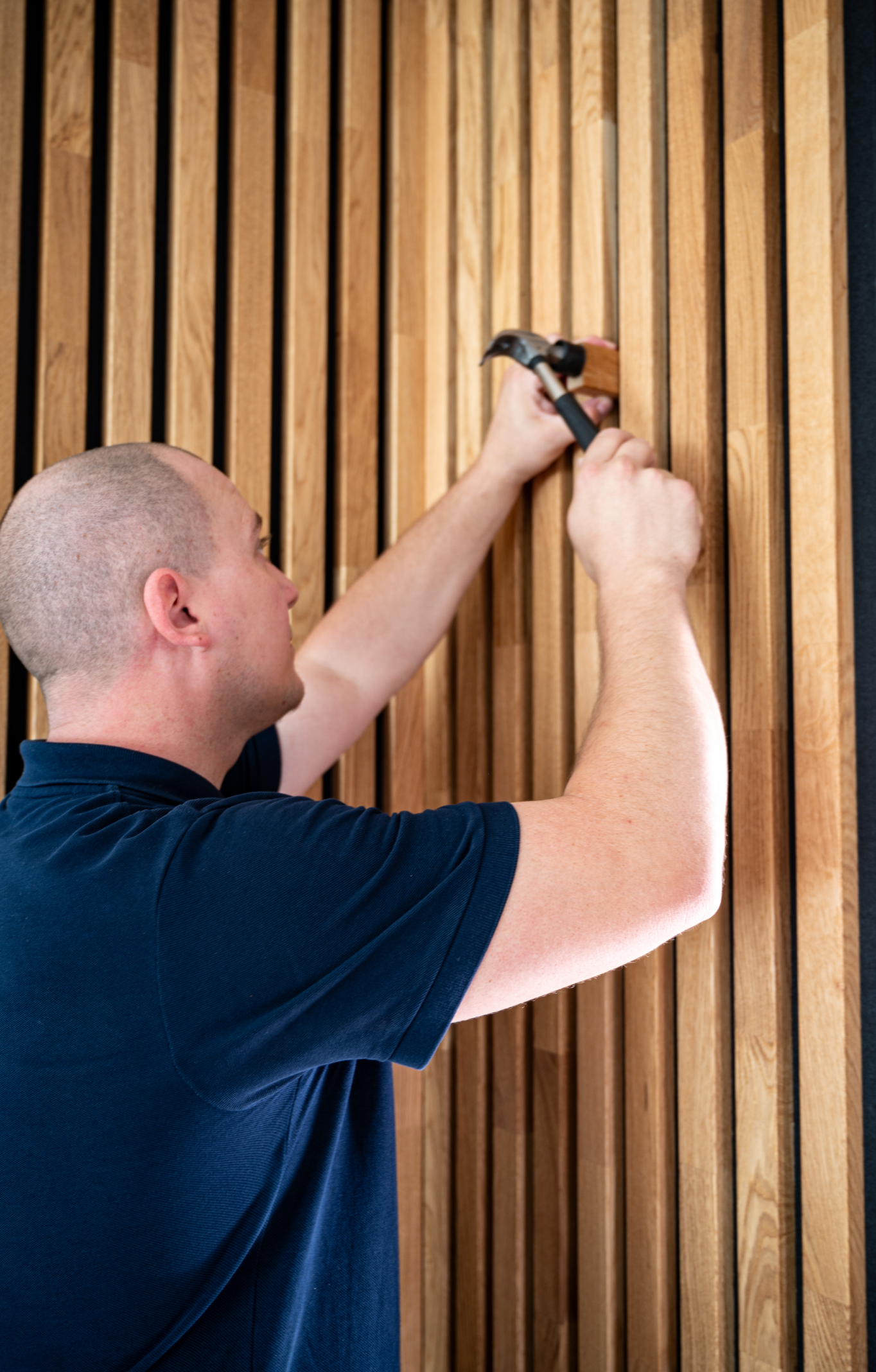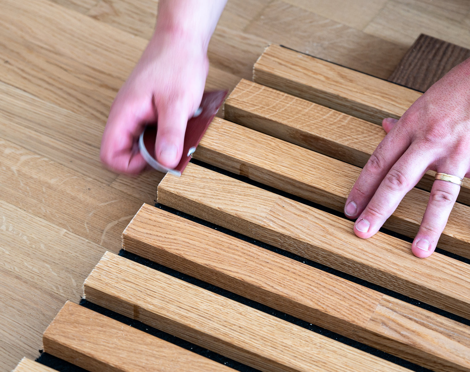 Unsere Massivholz-Akustikpaneele sind nicht nur optisch ansprechend und akustisch effizient, sondern auch einfach zuzuschneiden. Mit einer handelsüblichen Handkreissäge können Sie diese Paneele problemlos auf die gewünschte Größe zuschneiden.